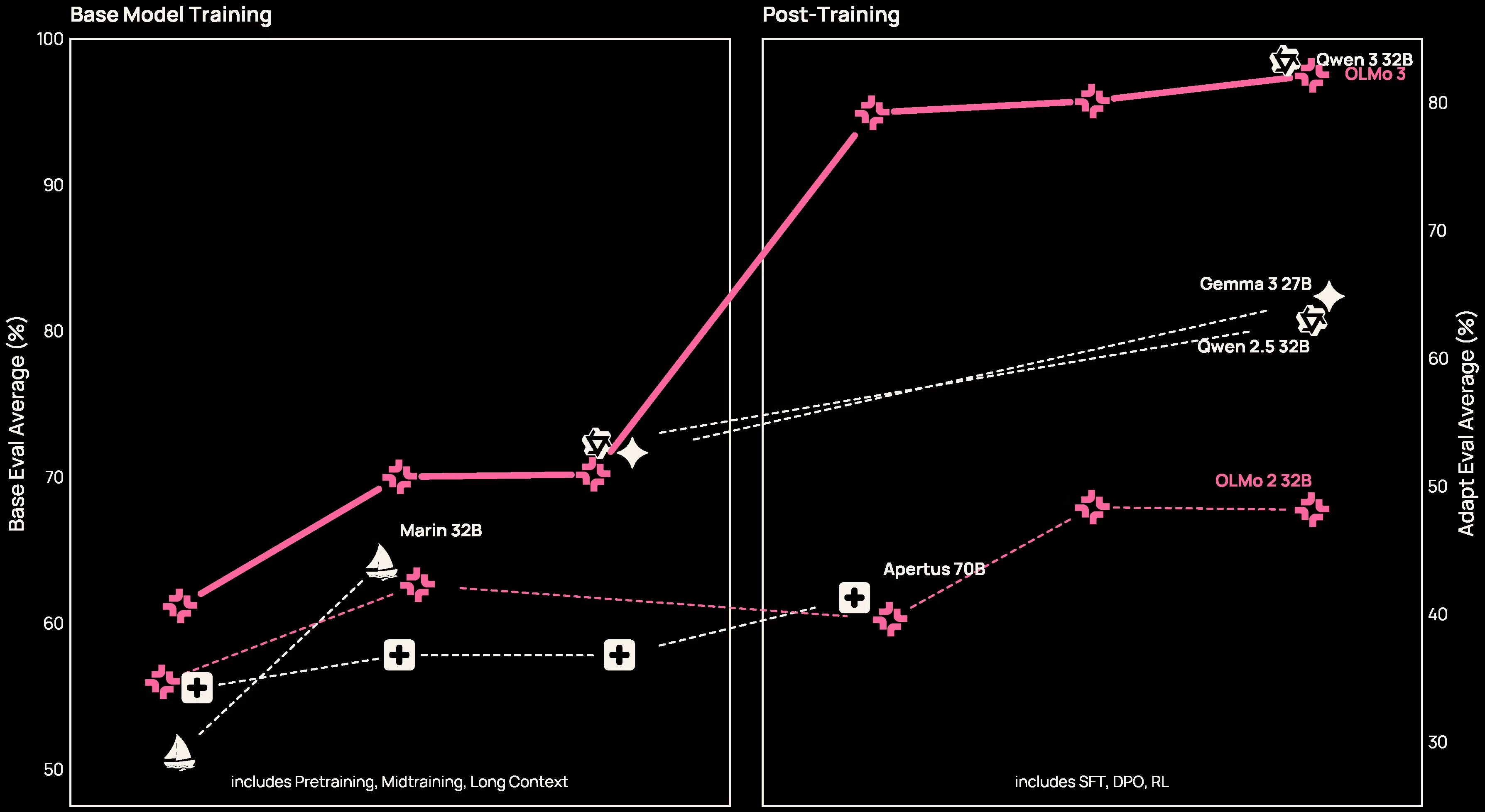 Integration with OlmoTrace allows researchers to connect model outputs directly back to specific training data in real time. The release includes checkpoints from every major training milestone, enabling developers to fork the model at any point in its development. Teams can study capability emergence over time, run ablations on specific stages, or customize training for domain-specific needs. All components are released under the Apache 2.0 license and are available through Hugging Face, the Ai2 Playground, and OpenRouter.