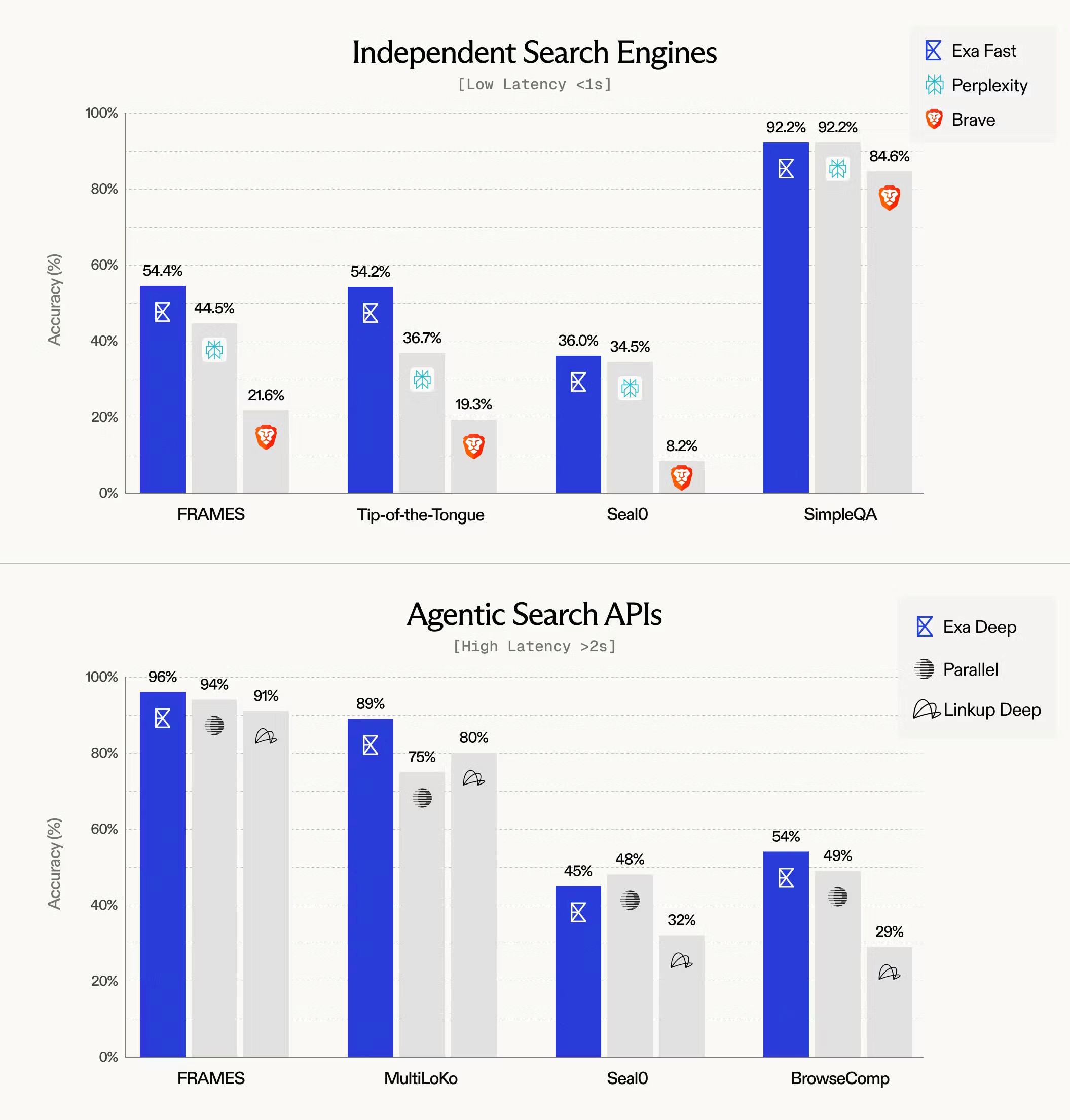 Exa Fast now operates at sub-500 millisecond latency while maintaining the highest accuracy in its category, according to the company's benchmarks. Most search APIs cannot break the 1,000ms barrier because they depend on Google's infrastructure with inherent speed limitations. Exa's independent document index and retrieval algorithms, developed over years of research, enable this speed advantage. The company ran evaluations using a SingleStep harness with GPT-4o-mini grading outputs against expected answers, completing tests on November 23, 2025.